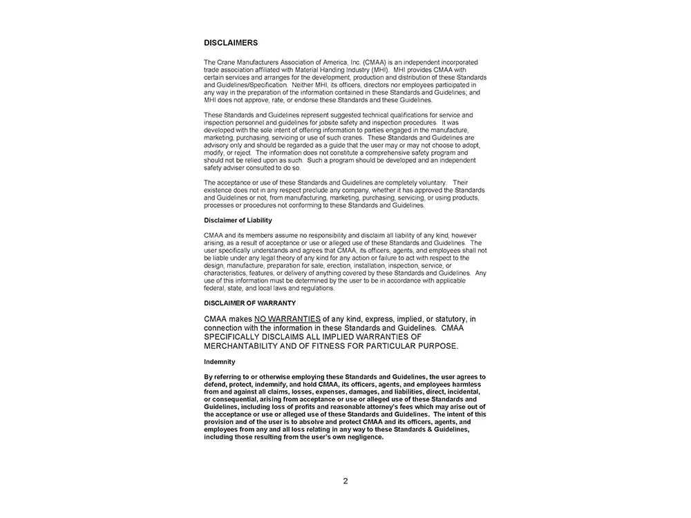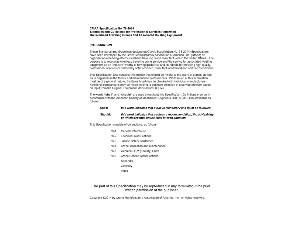 These Standards and Guidelines designated CMAA Specification No. 78-2014 (Specification) have been developed by the Crane Manufacturers Association of America, Inc. (CMAA) an organization of leading electric overhead traveling crane manufacturers in the United States. The purpose is to recognize overhead traveling crane service and the service for associated hoisting equipment as an “industry” worthy of having guidelines and standards for providing high quality, professional services performed by safety-minded, manufacturer-trained and certified technicians.